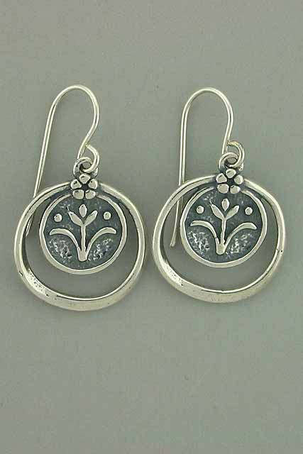 Hand made, sterling silver, hanging earrings with a replica of an ancient coin in its center. One Item only. Earrings: 1.25″ long.