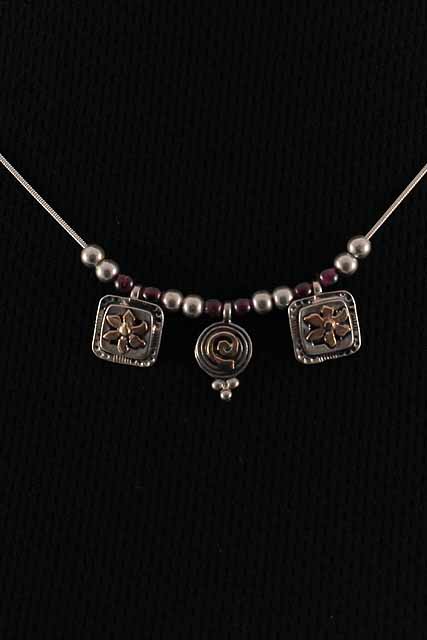 Gift a special person in your life with a two tone jewelry necklace that is more than just a necklace. This will be handcrafted and unique Israeli necklace that is a combination of sterling silver and gold. Sterling silver chain beads and pendents that are colorful with gold flowers and a spiral with add on Garnet stones.