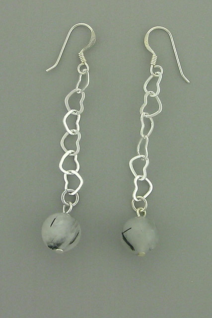 Hand crafted, silver hearts chain long earrings on a wire with Howlite stones. One item only. Earrings: 2.25 in. long.