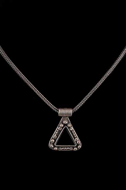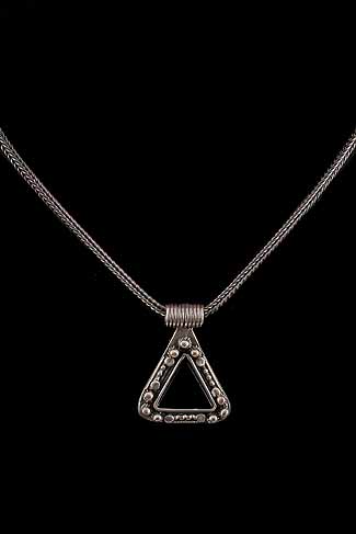 A modern approach to the time honored tradition of Yemenite art in Jewelry in sterling silver and Onyx stone. This artist continued in the footsteps of his ancestors. Woven and oxidized chain with a triangle pendent. His work is authentic and exquisite.