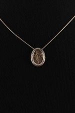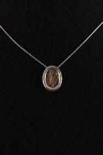 Chain: 15 in. long; Pendent: 0.9 in. long, 0.6 in. wide.