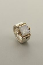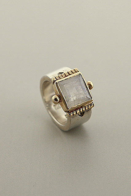 Hand made, two tone, Moonstone in wide, shiny and thick band with a gold frame.