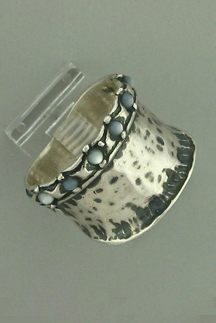 Hand made, hammered and oxidized, sterling silver ring with small moon stones crowned on one side. One item only from our contemporary collection.
