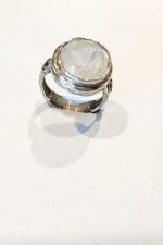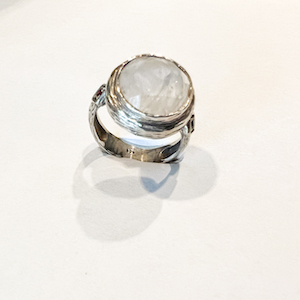 Sterling silver with one large Moonstone and two small garnets on the sides.