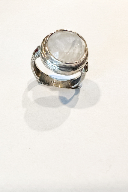 Textured sterling ring topped with large Moonstone and two small garnets on its size.
