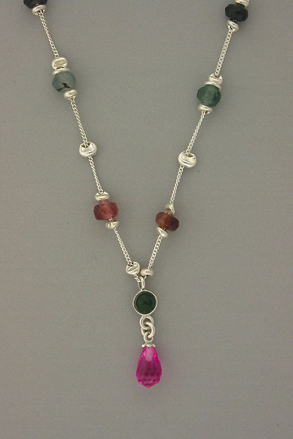 Hand crafted, sterling silver, fashion necklace with multi semi precious stones and a Pink Crystal drop to finish.Chain: 16 in. long.