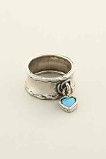 Hand made, sterling silver ring with a Blue Opal heart dangled stone and textured edges band.