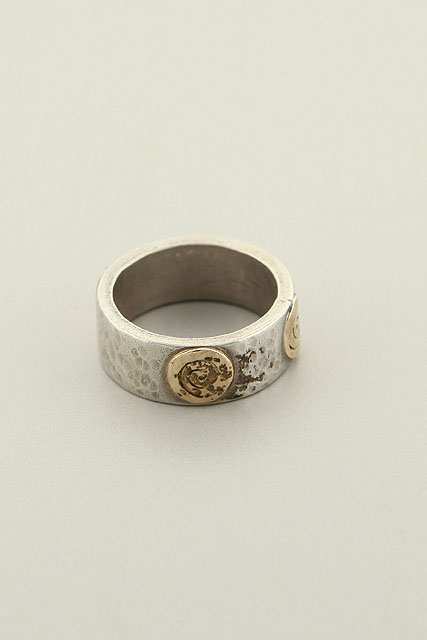 Hand made, two tone, matt, hammered, sterling silver band with a smudged of a gold spiral all over.
