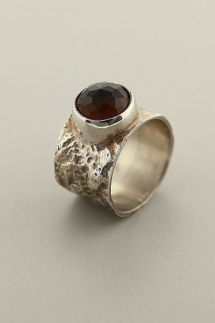 Hand made, sterling silver, wide band with an uneven texture and a mounted Smoky stone.