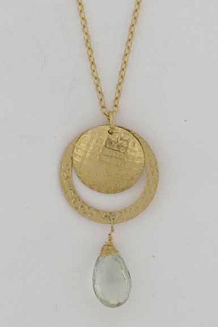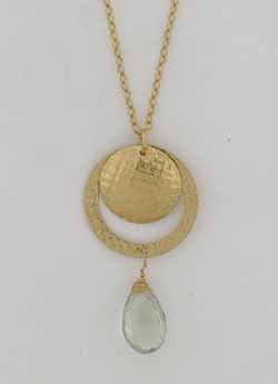 A GF fashioned jewelry necklace with A GF double round textured pendent and a Green Amethyst hanging of it.