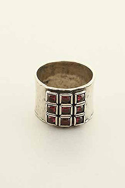 Hand made, sterling silver wide band with nine Garnet squares stones.