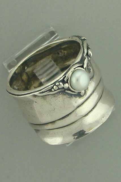 Hand made, sterling silver band, wider and wavy on top narrower at the bottom topped with a white pearl.