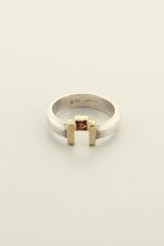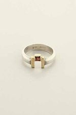 Contemporary, two tone ring concept for the artist in you. This sterling silver and gold with Garnet stone are a fresh breath of air in jewelry designs. Get yourself a step up contemporary ring when buying this ring.