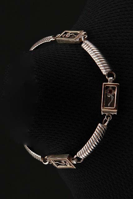 Hand made, two tone bracelet with a Garnet flower in a gold frame.
