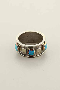 You are in your bio sun natural open fashion space when you wear this two tone ring. Imaging yourself wearing this wide, semi oxidized ring with five Blue Opals square stones set in gold. The harmony of a two tone jewelry with fiery sky color. Imagine that!