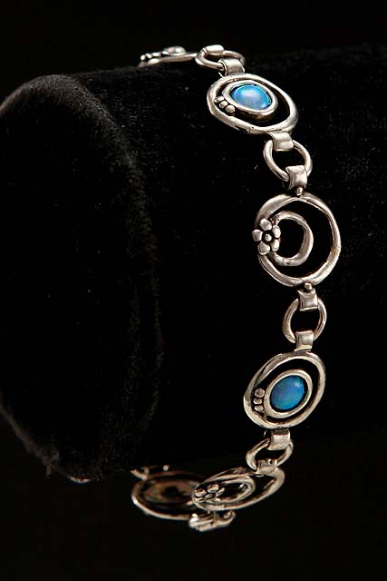 This bracelet is the taste of Israel that is so high in fashion. This shiny sterling silver bracelet with these fiery Opal round stones are so cheerful to the eye, suitable to all occasions and noticeable to all.