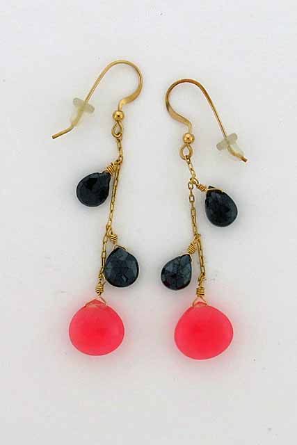 Gold-filled, long chain earrings with dangling Onyx and Pink Chalcedony stones to gold-filled wires.