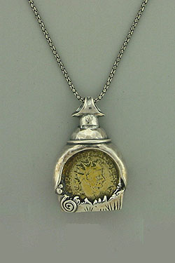 In Israel the love for ancient history is reflected on its unique fashion and meaningful look. This contemporary and hammered pendent frame with a replica of an ancient coin contributes to his unique-energy in jewelry and its popularity.