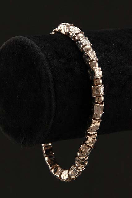 Sink into everyday contemporary indulgence with sterling silver beads and sterling silver particles. This casual lux draws you in with gleaming silver metal, constructed-hammered particles against smooth round beads. All together creating an elegant casual jewelry wear standing up for itself or as a stack on..