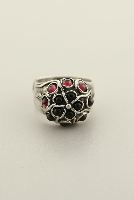 Casual dream ring with Garnets and Onyx stones rising-topped on sterling silver band. We have partnered with contemporary jewelry artist to create new palettes of a latest trend collection.