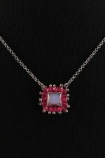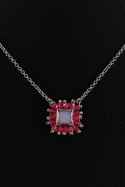 Hand made, sterling silver square necklace with Opalite and Hot Pink crystals.