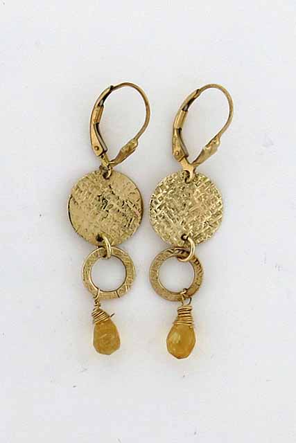 Gold-filled hanging wire earrings with a round, full textured plate and a hallow circle with a citrine drop stone.