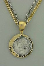 Hand crafted, fashion, two tone of sterling and gold plated with a two tier pendants of gold and a replica of a silver coin. One item only. Chain: 15 in. long; 17.5″ long with pendent.