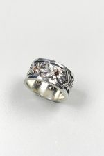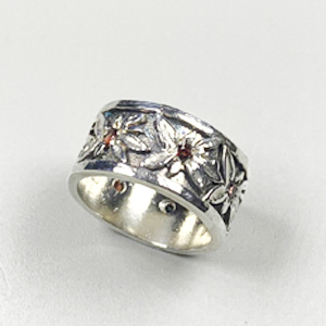 Sterling silver wide ring with flowers on top and Garnet red stones for decor.