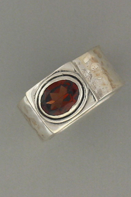 Hand made, sterling silver, slightly hammered band with an oval Red Garnet stone, sets on a square platform.