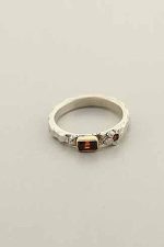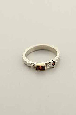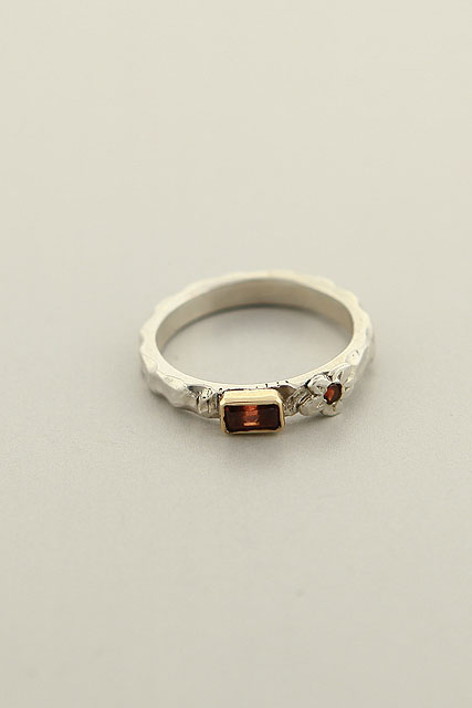 Hand made, two tone ring with a Garnet flower and a Garnet rectangle stone sets in a gold crown.