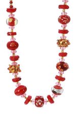 One of a kind, hand blown glass beads necklace in red tone, gold and silver.