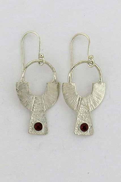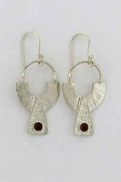 Striped and textured, sterling silver earrings with Garnet stones, hanging on wires.