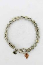 Sterling silver bracelet consisted with circles and diamond geometric shapes to a rose gold pomegranate and a silver bird charms for a finish.