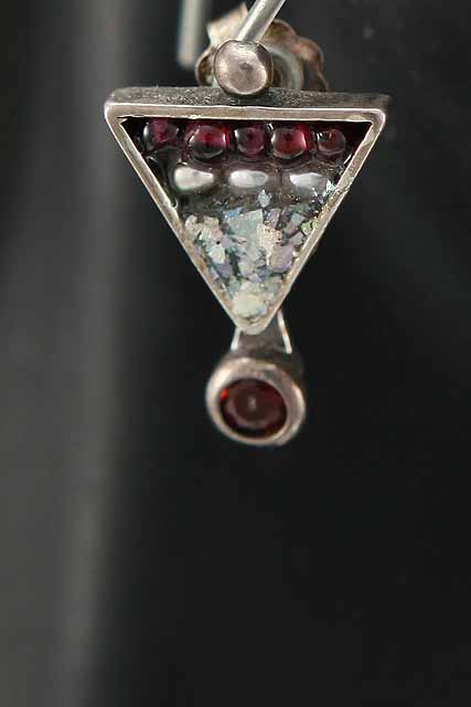 Hand made, sterling silver, post earrings with Roman Glass and Garnet stones.