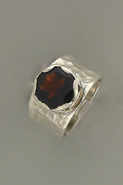 Hand made, sterling silver, wide and hammered band with Red Garnet stone mounted on top in its unique rise setting.