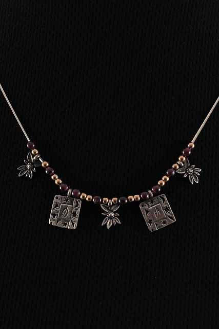 Hand made, sterling silver and gold necklace with Garnet stones and goldfield beads.
