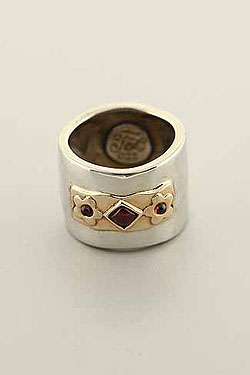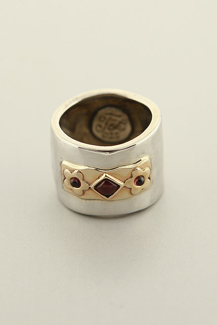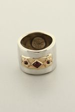 There is nothing more charming than a two tone jewelry-ring. Wide, sterling silver band with red gold and Garnet stones. Garnets have been all time popular, all year round jewelry – day or night.