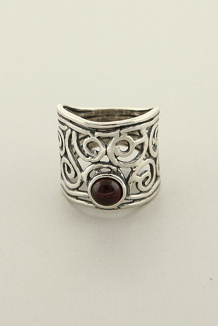 Hand made, wide sterling silver spiral ring with Garnet on a spiral net.