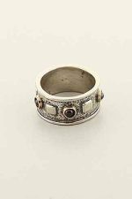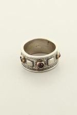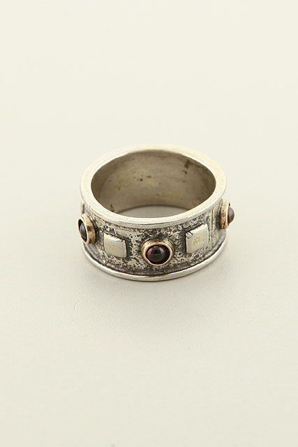 Hand made, two tone, contemporary, oxidized, wide band with Garnet stones and shiny edges.