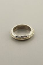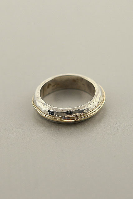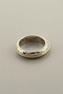 Hand made, two tone, hammered, sterling silver band with yellow gold ring raised in the center.