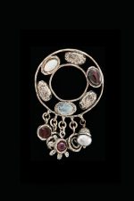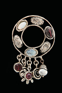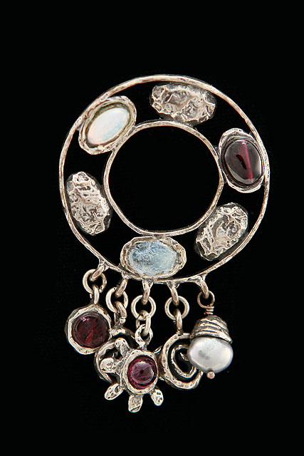 Hand made, one of a kind, sterling silver, Roman Glass pin with semi precious stones. Best for pin Or pendent.