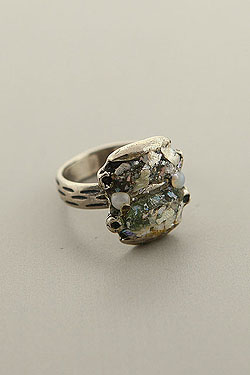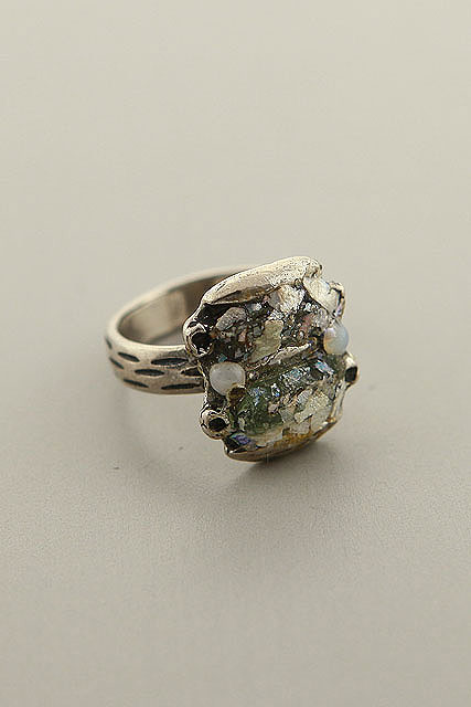 Hand made, sterling silver, rectangle ring with Roman Glass and Opalite stones. One of a kind.