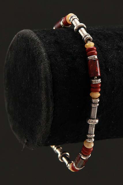 Hand made, sterling silver bracelet with a mix of semi precious stones to a toggle finish.