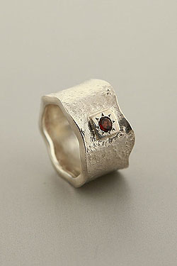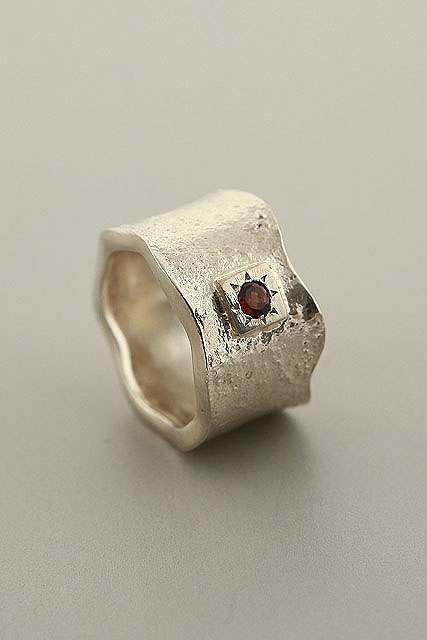 Hand made, sterling silver wavy textured band with Garnet stone in a square frame.