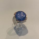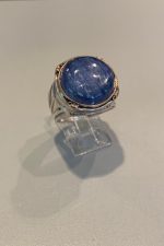 Handcrafted two tone ring. Sterling silver ring topped with Kyanite stone surrounded with gold trim.