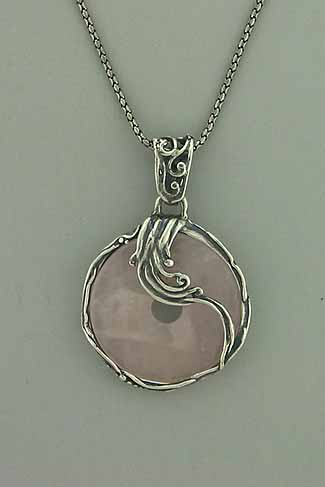 Hand made, sterling silver necklace, partially oxidized with a Rose Quartz donut from our contemporary collection. One item only. Chain: 15 in. long; 16.5 in. long with pendent.