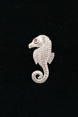 Hand made, sterling silver, Sea Horse pin with a red eye.