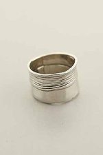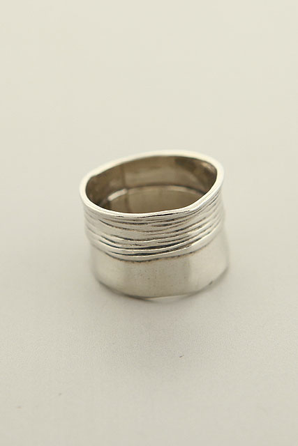 Classic sterling silver band is still evolving and more beautiful than ever. Seams details on one side vs. the shiny slick of its other side gives it a very cool and unique look.