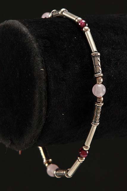 Hand made, alternate beaded bracelet with Garnets and Rose Quartz stones and sterling silver motives to a toggle finish.