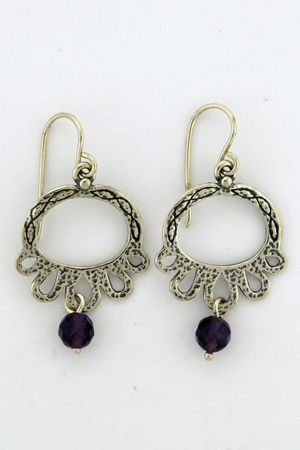 Textured sterling silver, hanging Euro-Ethnic designed earrings with Garnet stones.